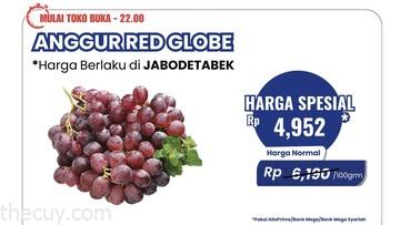 Di acara khusus ini, pelanggan dapat menikmati penawaran spesial untuk Anggur Red Globe di berbagai wilayah Indonesia. Misalnya, di Balikpapan, anggur tersebut dijual dengan harga Rp 4.000 per 100 gram, turun dari harga normal Rp 5.000 per 100 gram.