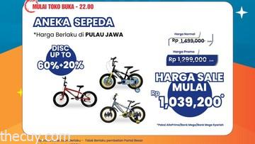 Transmart Full Day Sale masih berlangsung sepanjang hari ini dengan tampilan diskon besar. Berbagai produk, termasuk sepeda, ditawarkan dengan potongan harga yang menarik. Harga sepeda di Pulau Jawa, misalnya, ditawarkan mulai dari Rp 1.299.000 setelah diskon, dari harga asli Rp 1.499.000. Pelanggan yang menggunakan kartu kredit Bank Mega, Bank Mega Syariah, atau aplikasi Allo Bank dapat menikmati tambahan diskon 20%, sehingga harga menjadi Rp 1.039.200. Dengan begitu, kemurahan harga yang didapatkan dapat mencapai Rp 459 ribuan.