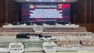 Uang tunai yang disita tersebut dipajang dalam acara tersebut, berupa pecahan Rp 100 ribu dan Rp 50 ribu, yang disusun rapi dalam plastik bening. Selain uang, tim juga memperlihatkan barang bukti digital lainnya.