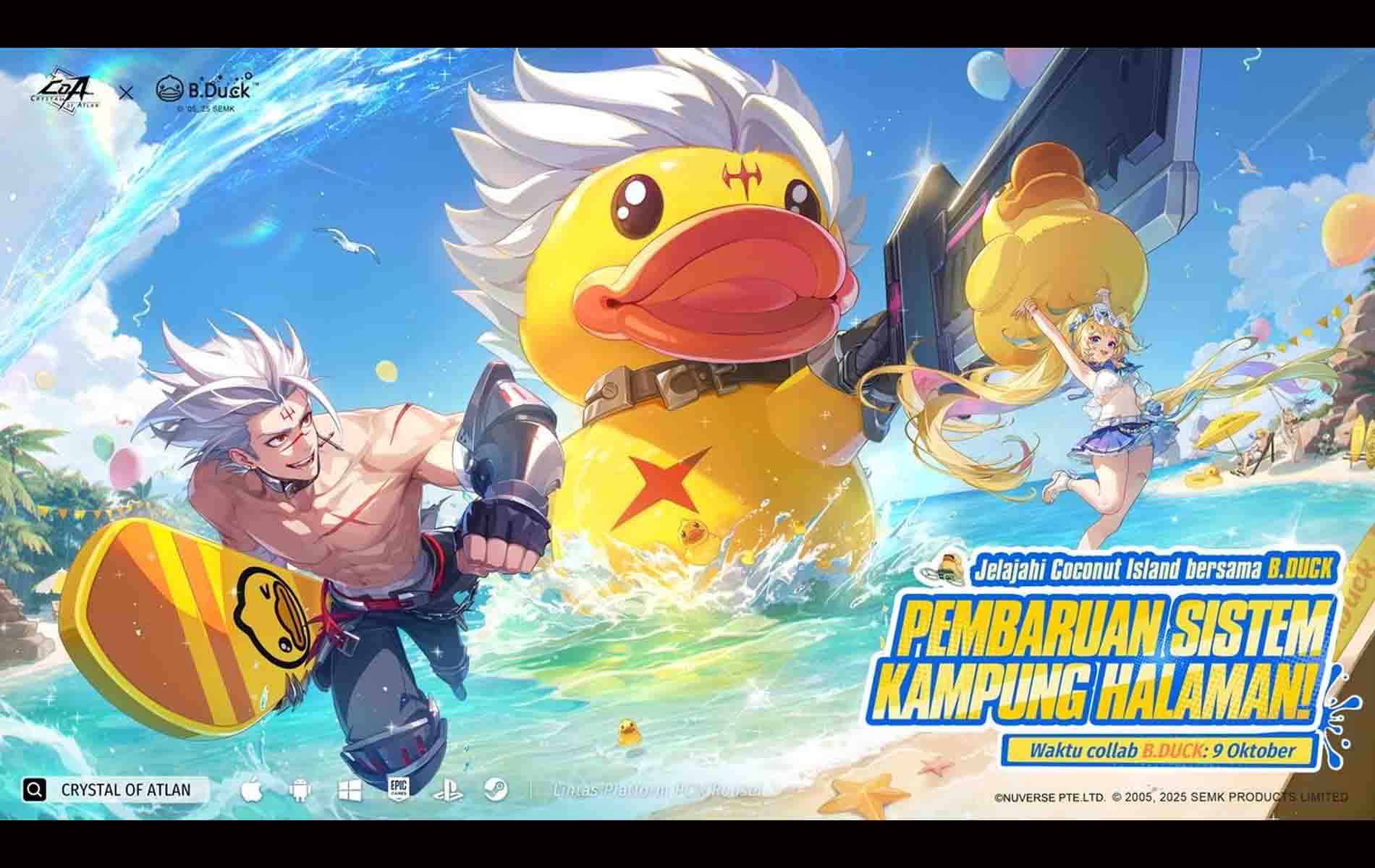 Versi terbaru Crystal of Atlan hadir pada 9 Oktober dengan kolaborasi eksklusif bersama B.Duck, karakter bebek kuning yang lucu dan menggemaskan. Selain itu, fitur Kampung Halaman baru juga akan dirilis, memungkinkan pemain untuk membangun dunia pribadi sesuai keinginan.