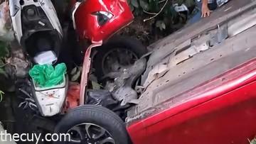 Kedua kendaraan pun masuk ke dalam sungai kecil dengan kedalaman sekitar dua meter dari permukaan jalan. Meski demikian, kedua pengemudi tetap selamat. Namun, pengendara motor mengalami cedera pada kaki kanan.