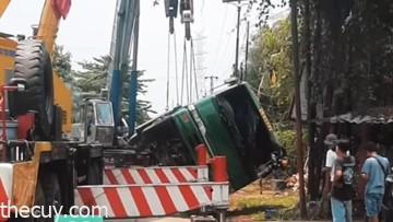 Sebuah truk pengangkut kontainer mengalami kecelakaan terguling di Desa Pasir Angin, Kecamatan Cileungsi, Bogor, Jawa Barat. Kejadian ini terjadi akibat kendaraan melewati tanah yang longgar.