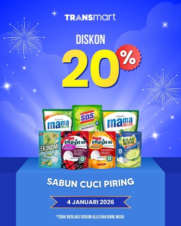 Khusus pada hari Minggu (4/1/2026), sejak gerai dibuka hingga pukul 22.00 waktu setempat, produk sabun cuci piring mendapatkan potongan harga sebesar 20%. Beberapa merek populer seperti Mama Lemon, Fresh 99, Ekonomi, dan S.O.S turut serta dalam promo ini. Namun, perlu diketahui bahwa diskon ini tidak berlaku jika menggunakan Allo Bank atau Kartu Kredit Bank Mega.